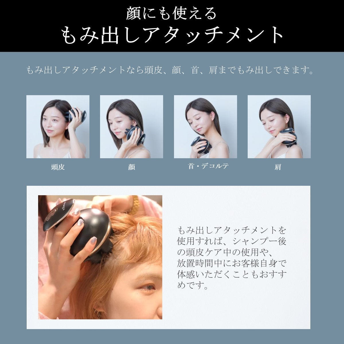 もみ出しアタッチメントなら頭皮、顔、首・デコルテ、肩までもみ出しできます。